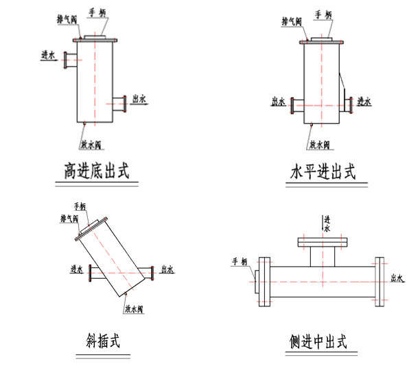 我們將根據(jù)客戶的現(xiàn)場尺寸及運(yùn)行工況,在滿足通流比的情況下,為客戶量身定做不同形式的濾水器,如水平進(jìn)出式、斜插式、高進(jìn)低出式、側(cè)進(jìn)中出式等。